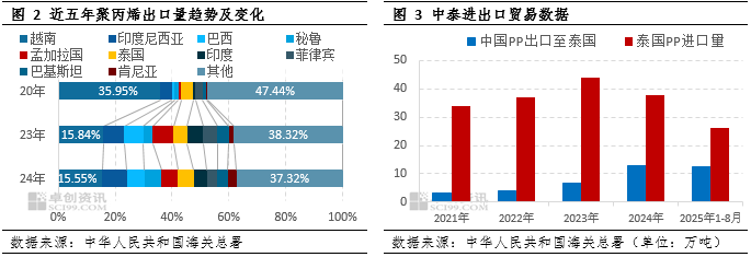 2021年起国内生产企业以及贸易企业积极布局与开拓出口市场,近年来出口体量震荡上升。2024年中国PP出口体量达到240.66万吨,而2025年中国PP出口量预计将再创新高,1-8月出口量已突破200万吨达到210.35万吨,较去年同期增幅在29.03%。从中国PP出口贸易伙伴情况来看,有超30%的出口流向东南亚国家,出口至泰国的体量也在下游需求发展的过程中达到新高,从2021年的2.18万吨到2025年截至8月已累计出口至泰国12.44万吨,增长率在469.5%。因而泰国此次反倾销调查也使得中国在东南亚区域的出口蒙上一层淡淡的阴云。
